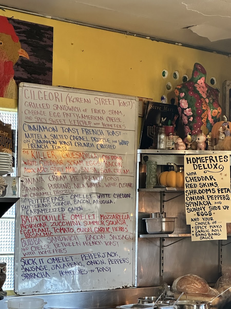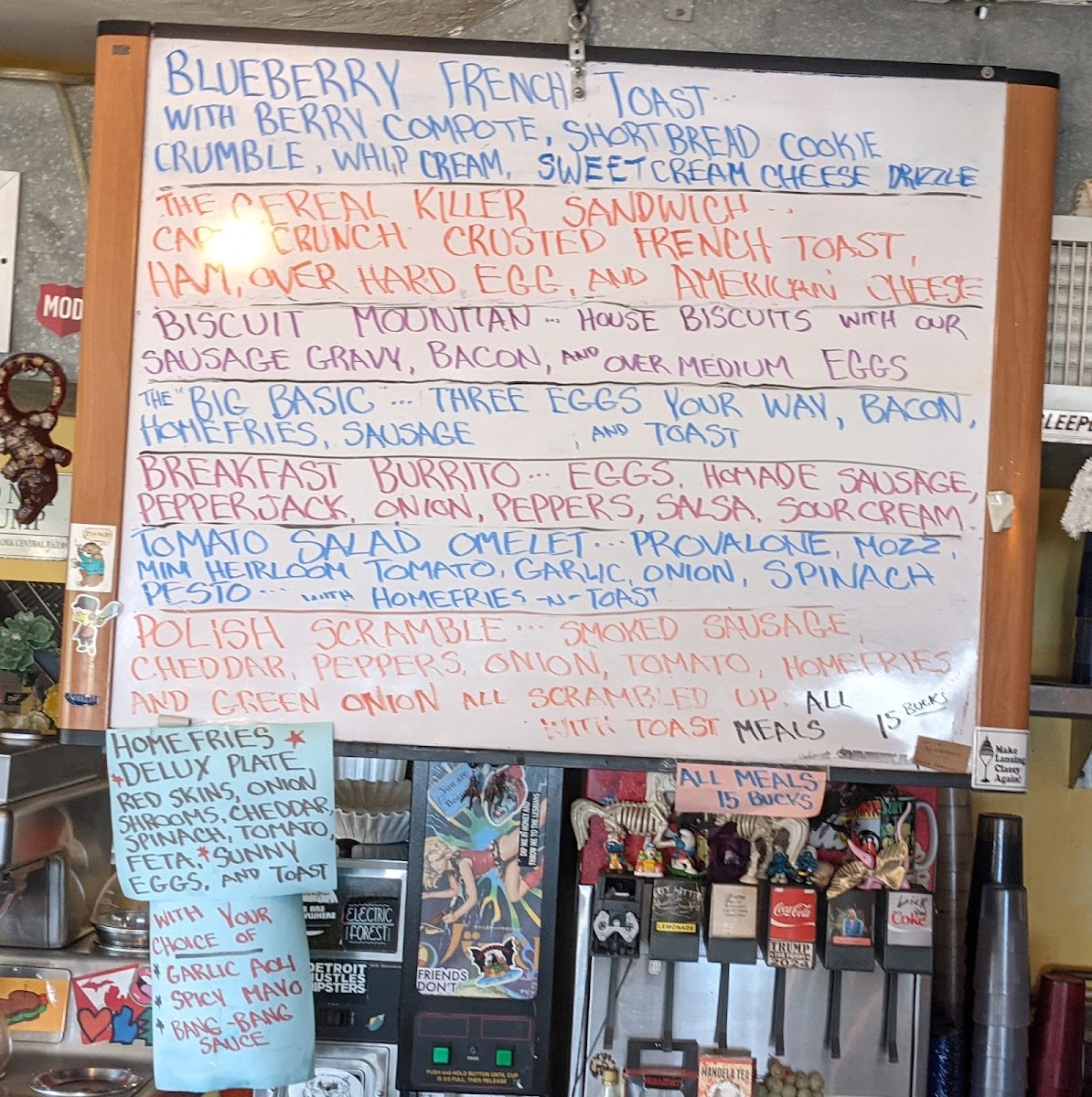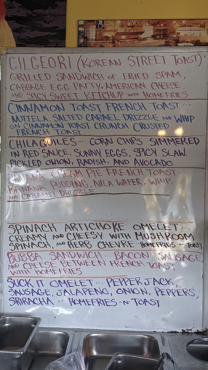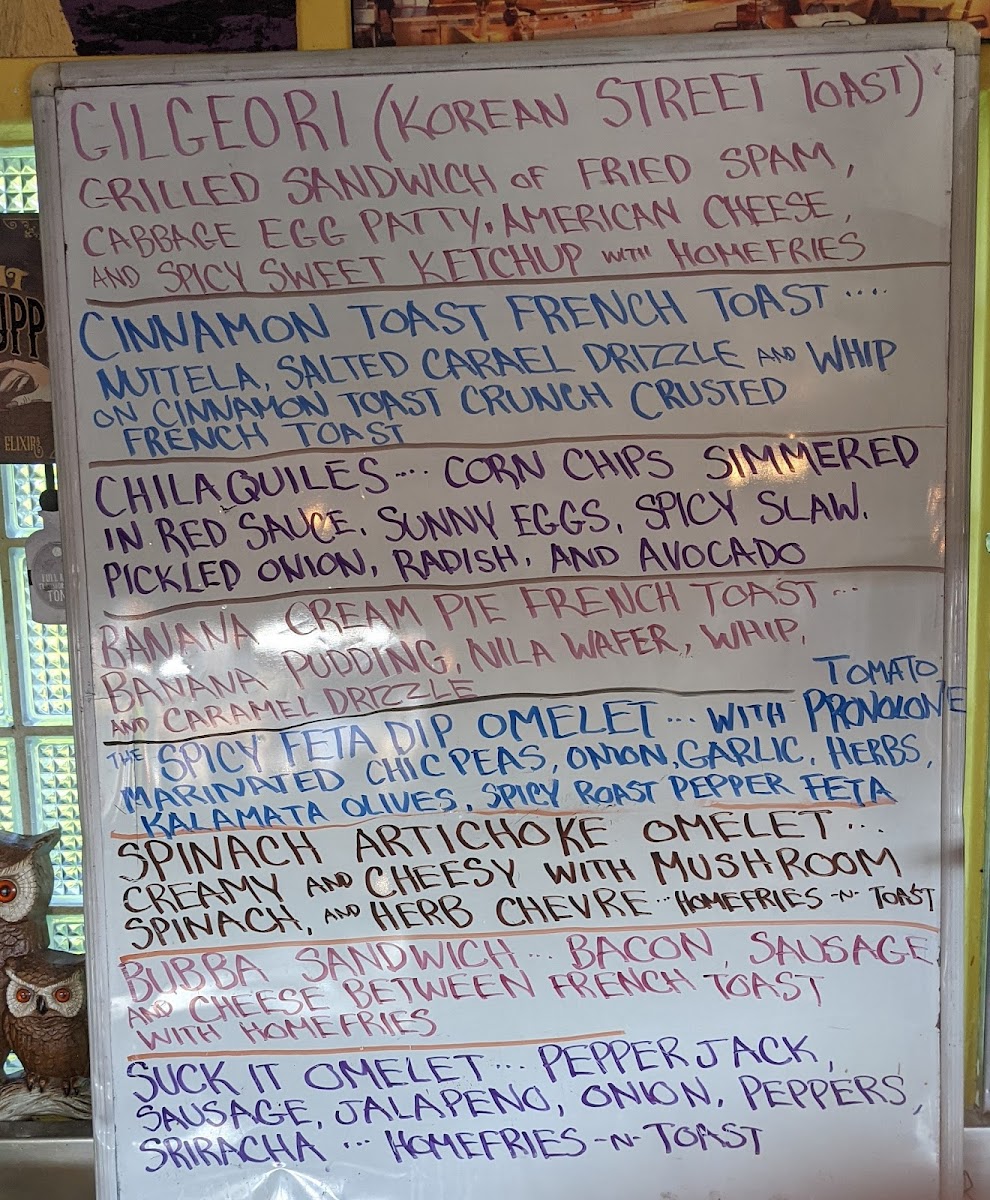 Meals are designed for casual dining typical of a brunch or breakfast restaurant, with patrons often ordering from a concise but eclectic menu. The setting and service support relaxed meal times rather than quick-service ordering.