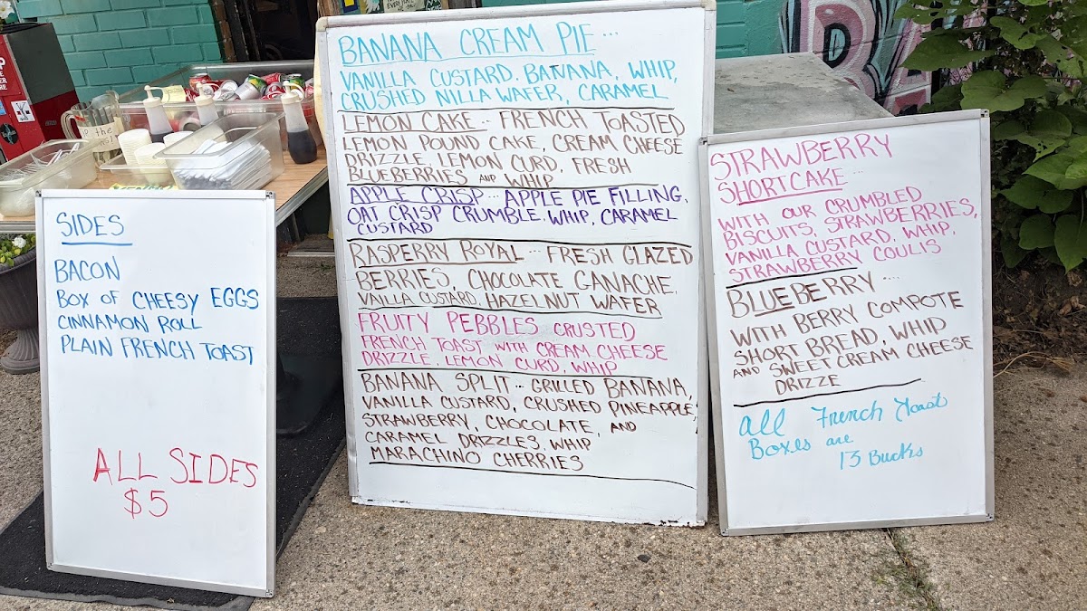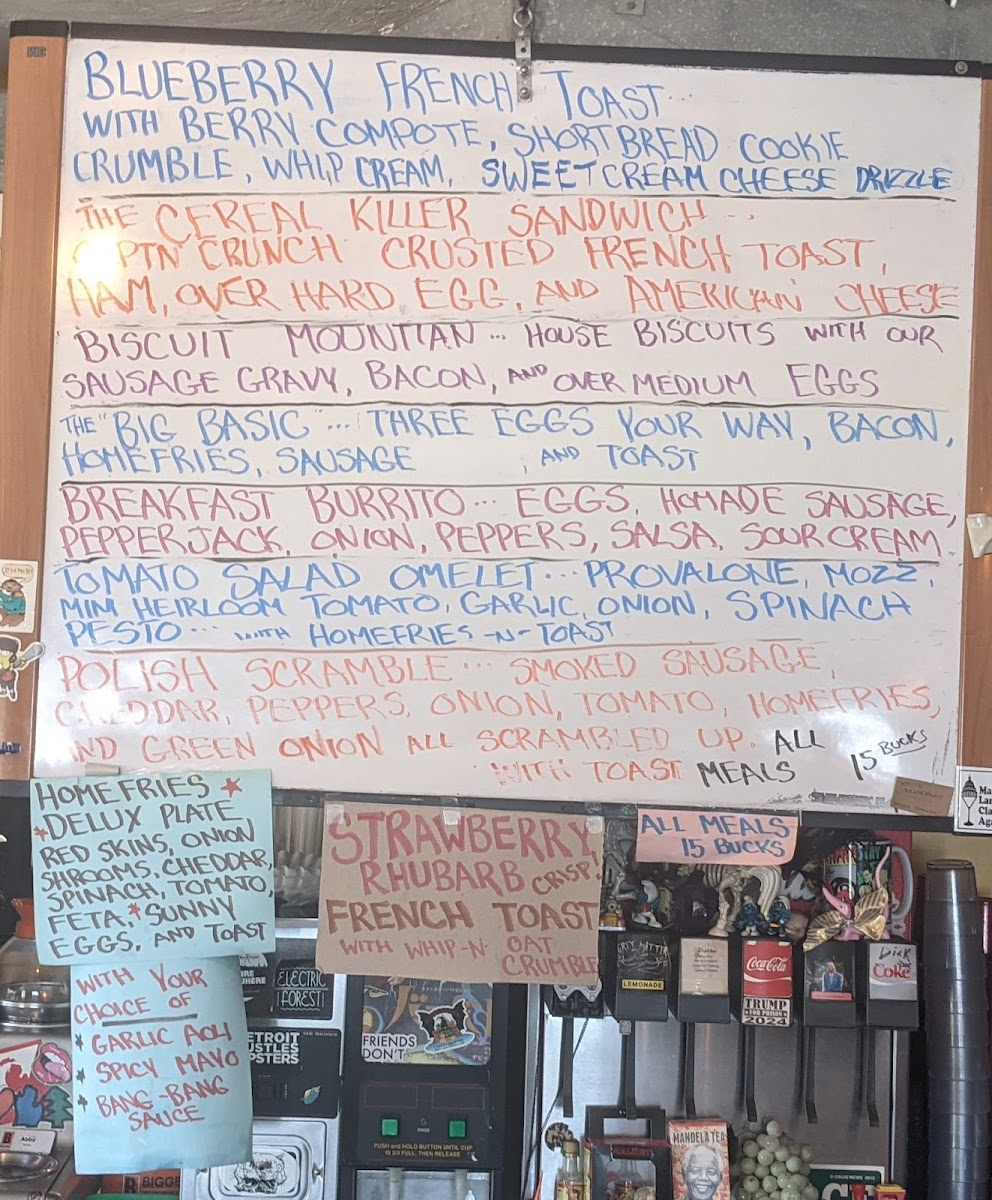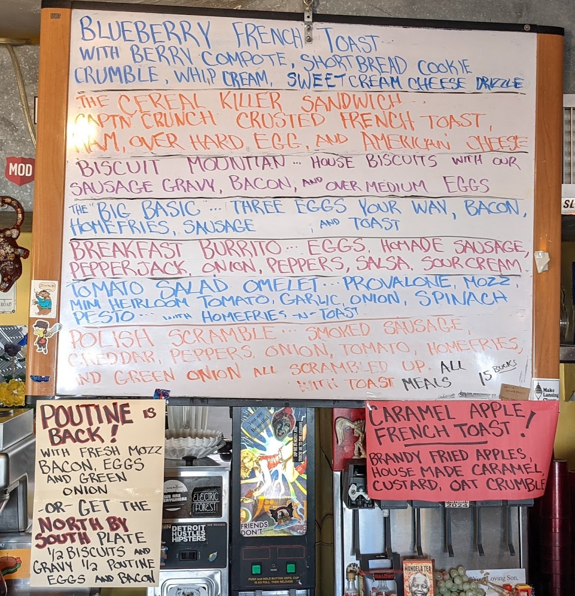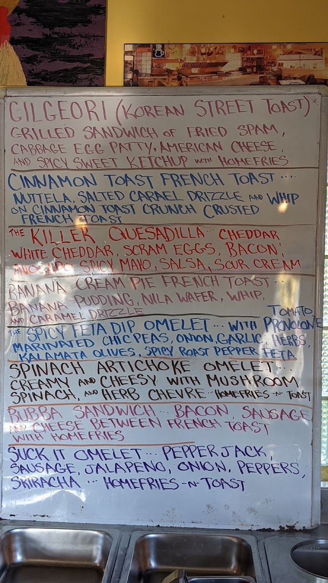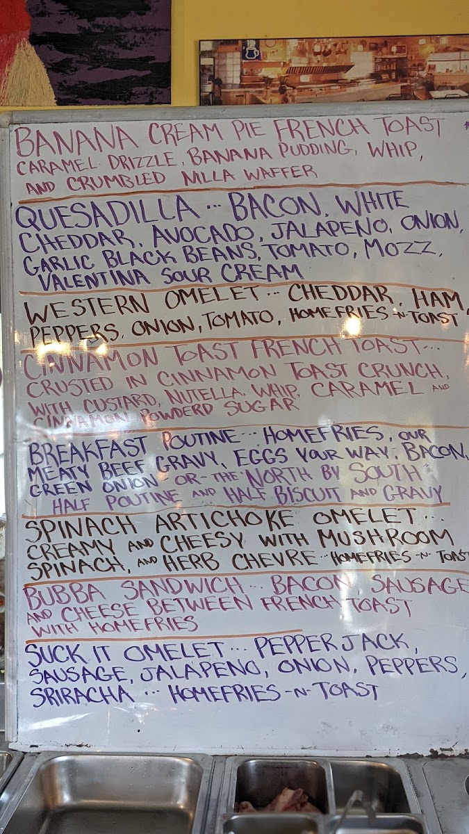 Meals are designed for casual dining typical of a brunch or breakfast restaurant, with patrons often ordering from a concise but eclectic menu. The setting and service support relaxed meal times rather than quick-service ordering.